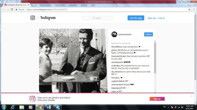 مورینیو بعد از مرگ پدرش عکسی از خود را در کنار او بدون این که چیزی بنویسد منتشر کرد.