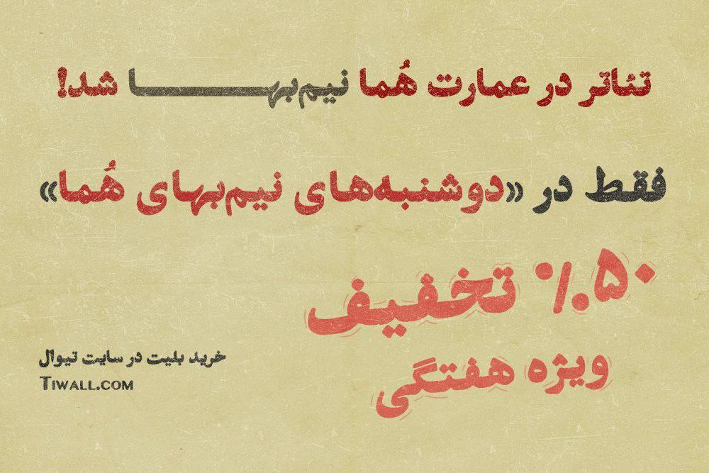 براین اساس، عمارت هما در راستای حمایت از تماشاگران و ایجاد فرصت مناسب برای بسیاری از علاقهمندان به تماشای آثار نمایشی این عمارت، از این پس دوشنبههای هر هفته با ارائه ۵۰ درصد تخفیف ویژه فروش بلیت میزبان مخاطبان خواهد بود.
