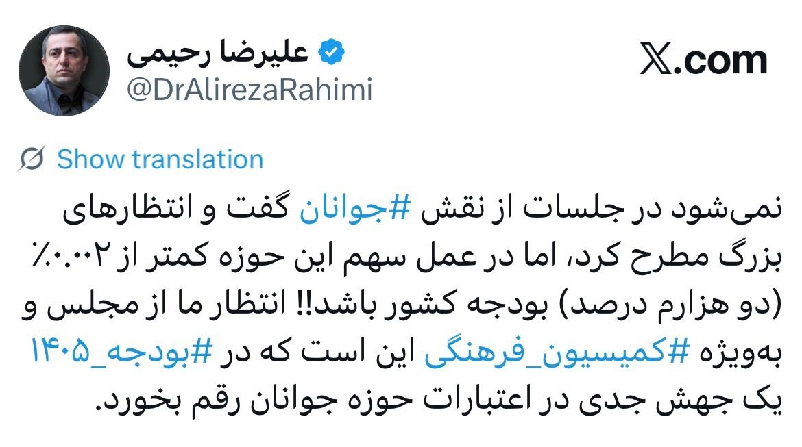 نمیشود در جلسات از نقش جوانان گفت و انتظارهای بزرگ مطرح کرد، اما در عمل سهم این حوزه کمتر از ۰.۰۰۲٪ (دو هزارم درصد) بودجه کشور باشد!!