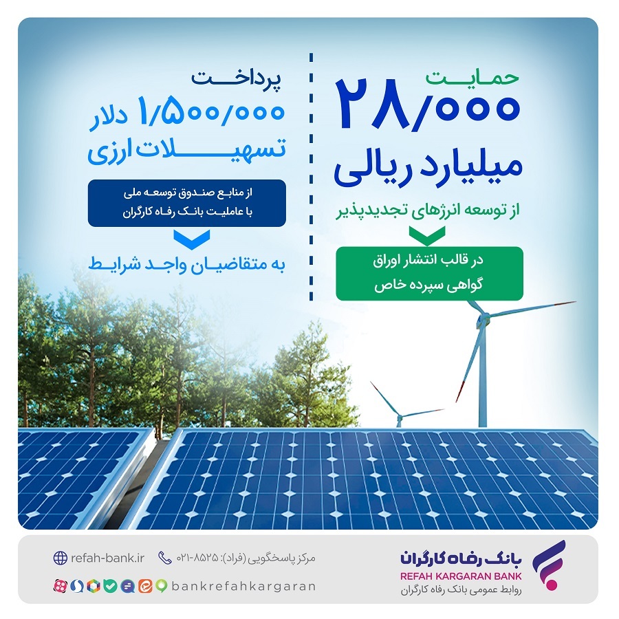 نشان تجارت - به گزارش روابط عمومی بانک رفاه کارگران، بانک در این سال به منظور حمایت از توسعه انرژیهای پاک حدود ۲۸.۰۰۰ میلیارد ریال تسهیلات ریالی به شرکتهای فعال در این حوزه پرداخت کرده است.