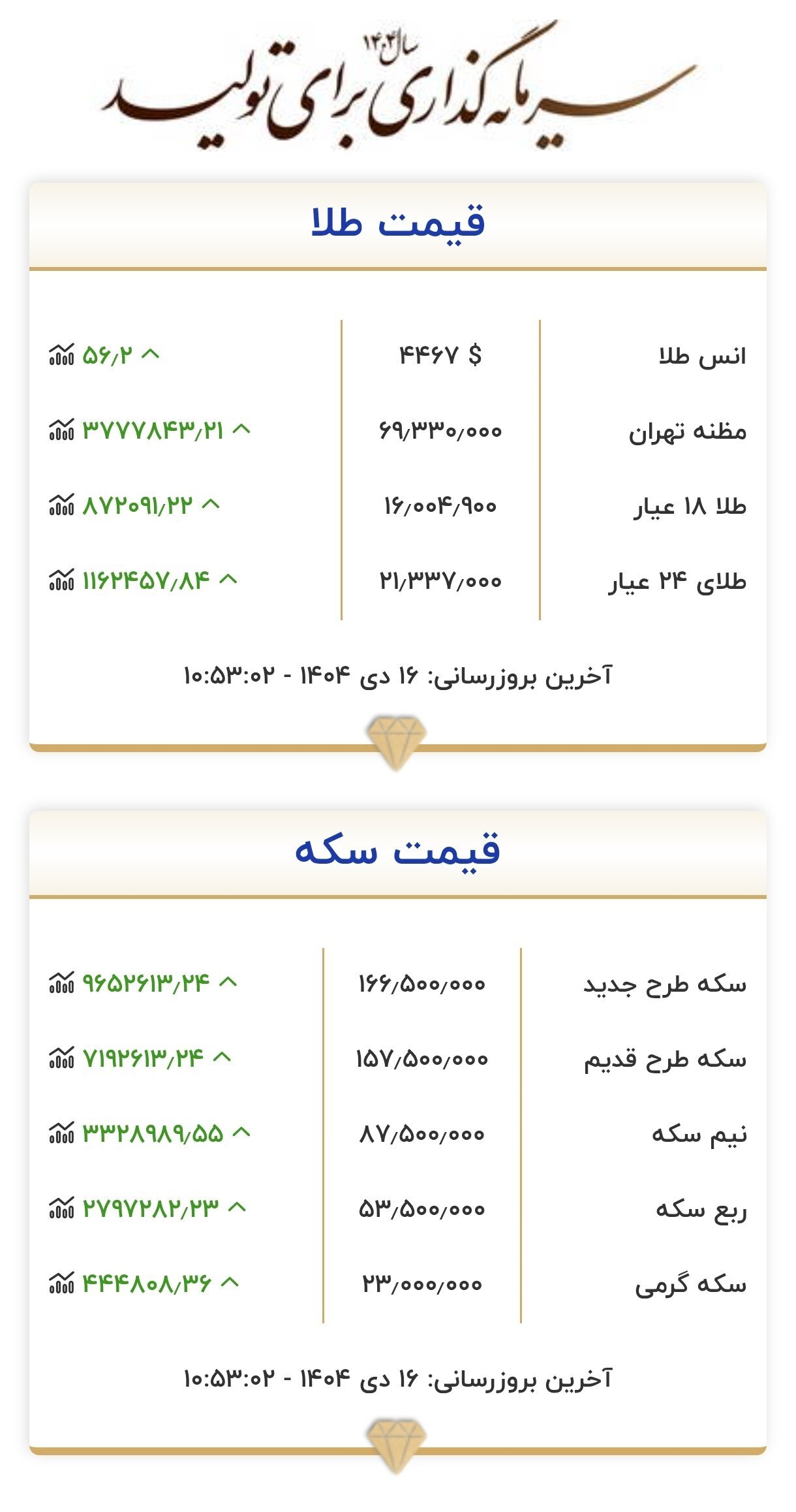 نشان تجارت - قیمت هر گرم طلای ۱۸ عیار در بازار امروز سه شنبه ۱۶ دی ماه با ۳۲۰ هزارتومان افزایش به ۱۶ میلیون و ۱۳ هزارتومان رسید.