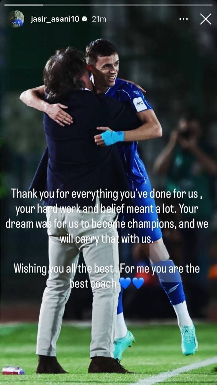 نشان تجارت - یاسر آسانی ستاره دوملیتی استقلال در واکنش به جدایی ناگهانی ریکاردو ساپینتو از جمع آبی پوشان عکسی از خودش در آغوش مربی پرتغالی در اینستاگرام استوری کرد.